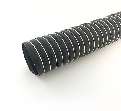 管壁為氯丁橡膠包覆的單層玻纖布, 彈性鋼絲加強(qiáng),管身外部有玻纖線加固