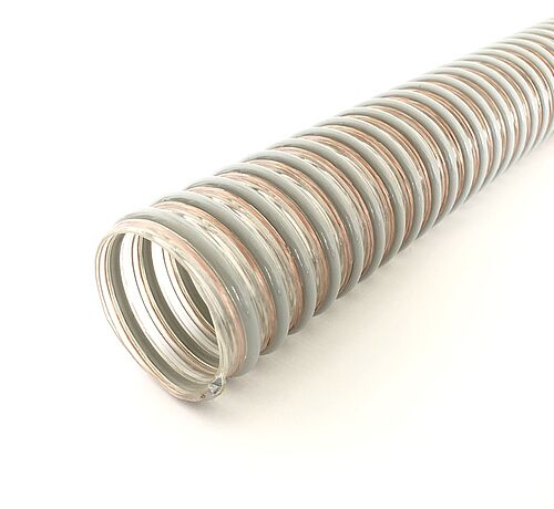 輕型,彎曲非常靈活的PU軟管,管壁材質(zhì)為聚酯型TPU, 抗沖擊PVC塑筋加強,銅線接地可排靜電